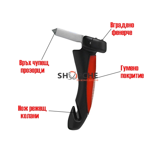 При спешен случай можете да счупите стъклото на колата с върхът на дръжката.