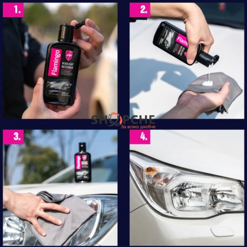 👉 Присъедини се към Viber общносттаВъзстановете мътни, тъпи, пожълтели фарове. Фламинго изчиства стъклата на фаровете и добавя защитен слой с една лесна стъпка. Не е необходима шкурка. Уникалната комбинация от полиращи смеси и защитният слой на Flamingo улеснява поддържането на ясни фарове и подобряването на видимостта. Начин на употреба: Разклатете добре преди употреба. Измийте добре и подсушете фаровете. Нанесете малко количество върху на фаровете със суха кърпа. Нанесете с кръгови движения, като използвате силен натиск. Избършете фара с чиста, мека кърпа или микрофибърна кърпа. За силно окислени фарове, повторете нанасянето. Използвай те предпазни средства за очи и ръце, като предпазни очила и гумени ръкавици.