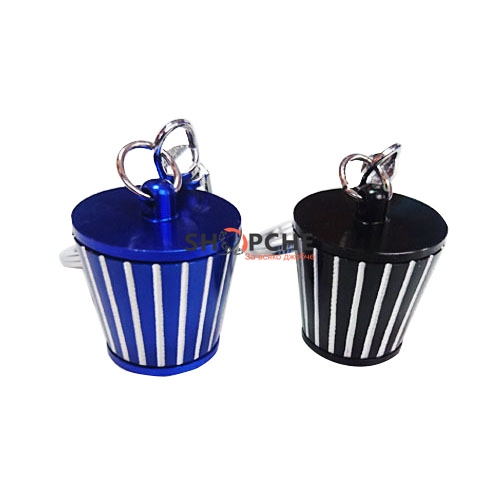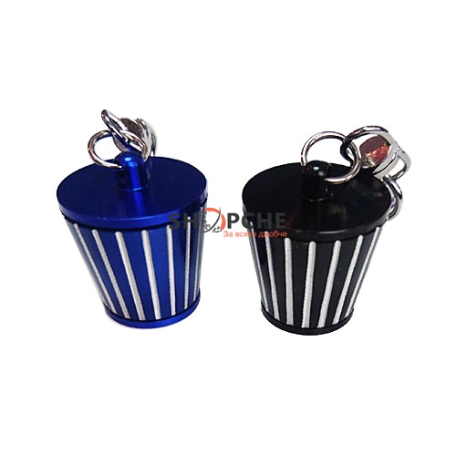 Този ключодържател във формата на филтър идва в два цвята – син и черен.