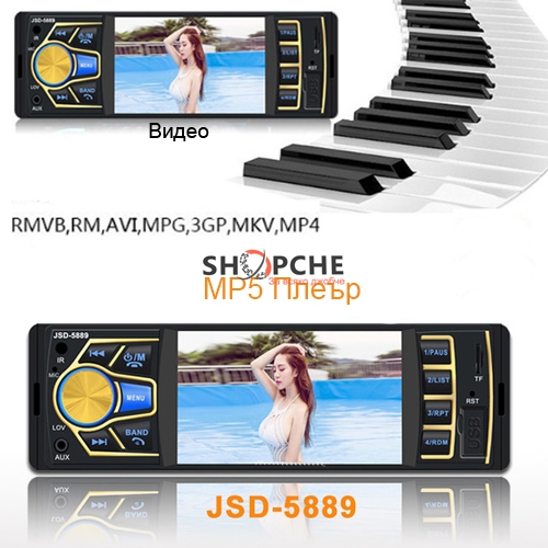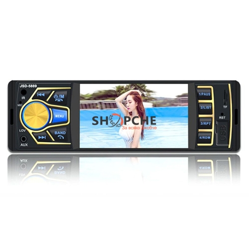 MP5 плеъра JSD-5889 може и да работи като обикновено FM радио, с възможност за автоматично търсене и съхранение до 18 станции или като MP3 плеър. Можете да свържете USB памет или SD/MMC карта заредена с MP3 или WMA файлове, за да слушате любимата си музика и да гледате любимите си филми и видеоклипове на LCD 4.3 инчов екрана.