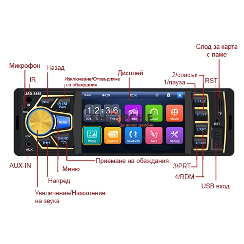 👉 Присъедини се към Viber общносттаПредставяме Ви новото Авторадио MP5 плеър JSD-5889 за кола LCD 4.3 инчов дисплей с часовник,слот за поставяне на SD/MMC карти, както и USB вход и дистанционно управление за лесно и удобно ползване.
