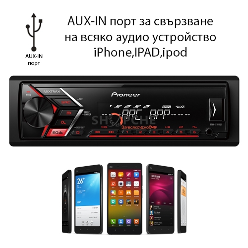 AUX-IN порт за свързване на всякакво аудио устройство, включително Ipod, iPhone, IPAD, както и всички 3.5mm аудио устройства- телефони, MP3, MP4, и т.н.