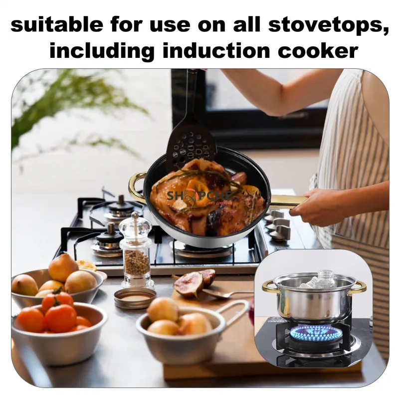Комплектът е подходящ за всички видове котлони – включително индукционни, електрически, газови и халогенни. Благодарение на инокс материала, съдовете са устойчиви на корозия, надраскване и деформации, като запазват своя блясък и функционалност дълги години.