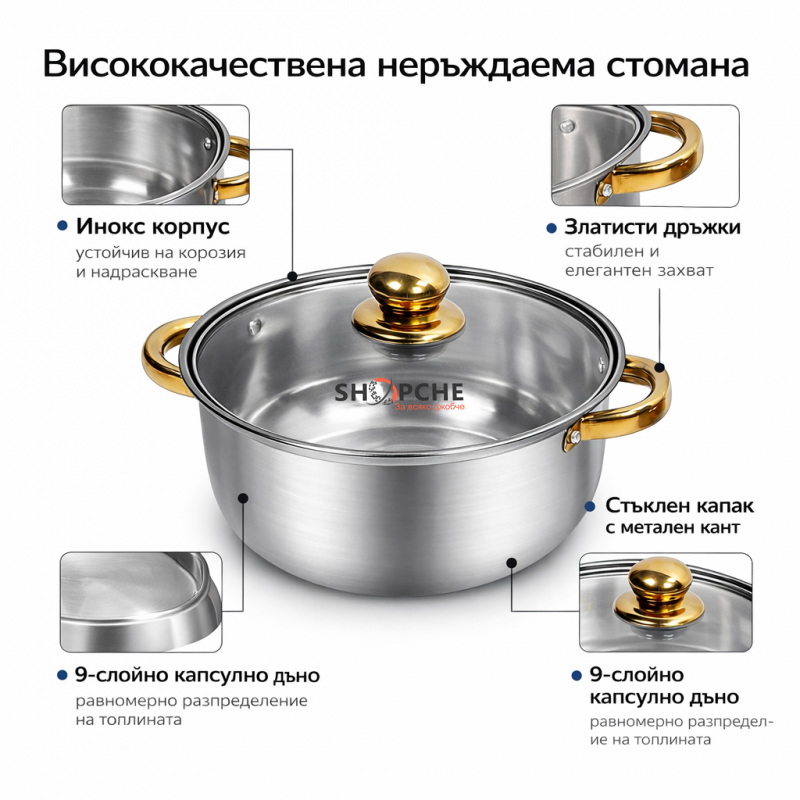 9-слойното дъно осигурява бързо загряване и оптимално задържане на топлината, което намалява разхода на енергия и подобрява качеството на готвене.