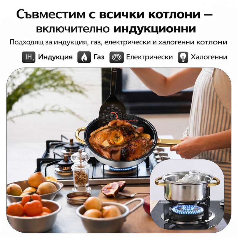 Съвместимост: Индукционни, газови, електрически, халогенни котлони