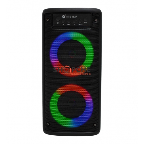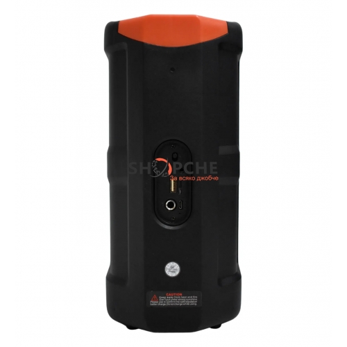 3-инчов х 2 високоговорител с LED светлина при възпроизвеждане на музика, свързва се през bluetooth, USB, micro SD, Aux 3.5 mm. и идеален за караоке, което има вход за микрофон. Има обхват от около 10 метра. Батерията му е акумулаторна и издържа 4 непрекъснати часа, включва кабел за зареждане.