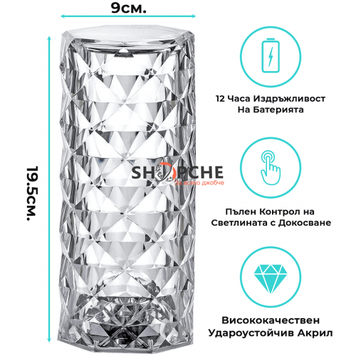 👉 Присъедини се към Viber общносттаТази кристална лампа е направена от акрил с вид на бели кристали, фокусирани към балансираната класическа красота. При модерната кристална лампа е обрнато внимание на визуалното въздействие и динамиката на формата, които създават очертания, без да подчертават структурната симетрия. Тя е подходяща както за нощна лампа, така и за украса и декорация на маси, секции и др.