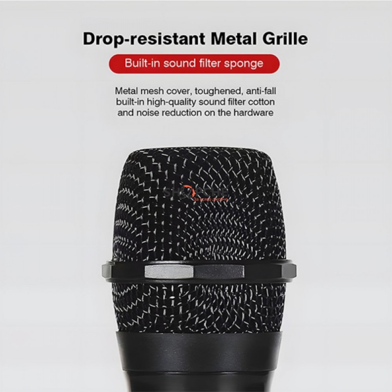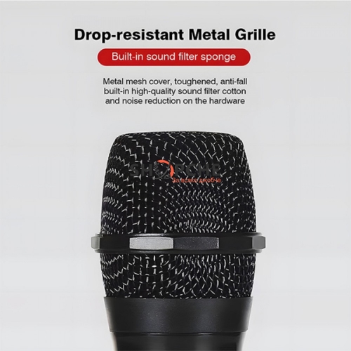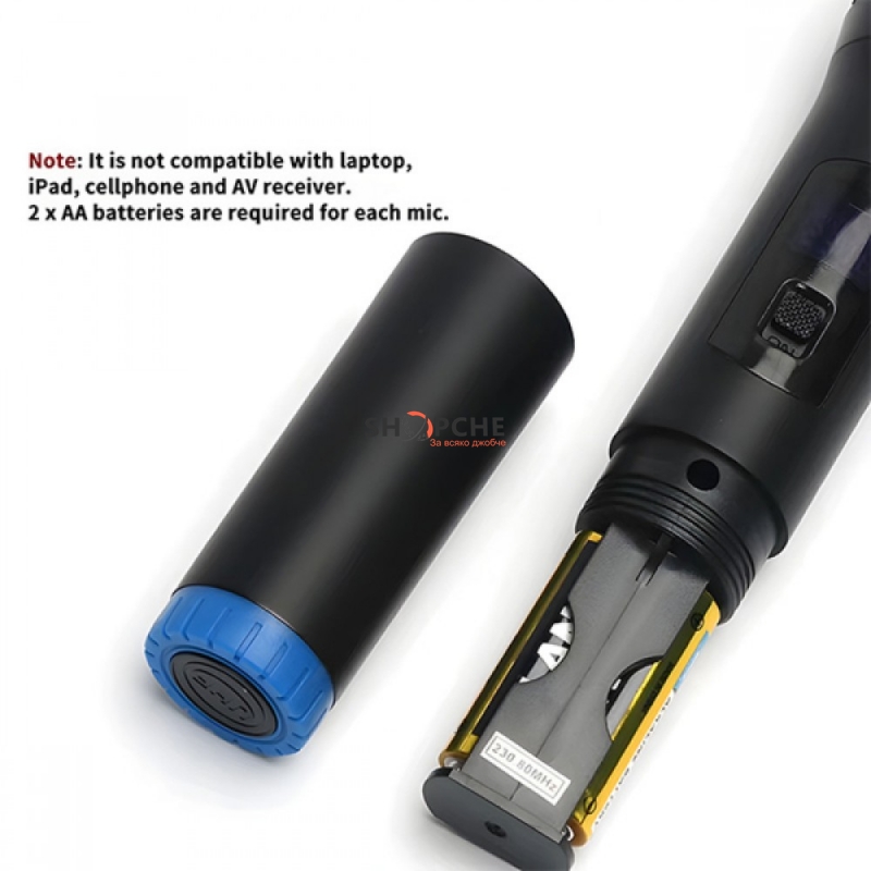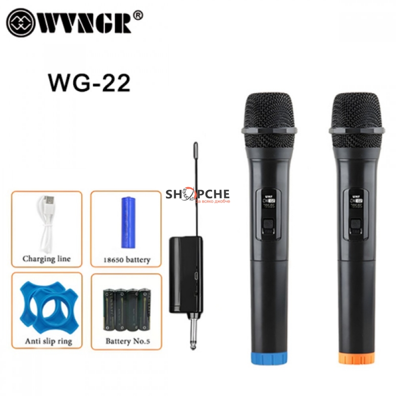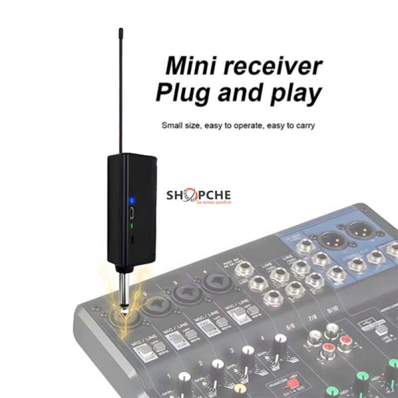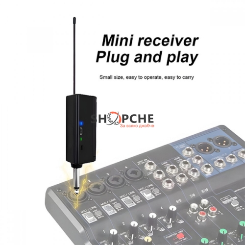 Безжичен универсален микрофон, който може да се ползва с всяка колона с вход за микрофн 6,3мм моно жак. Използва батерии 2бр. АА 1,5V, лесно за употреба. Трансмитъра използва една акумулаторна батерия 3,7V тип 18650 включена в комплекта. Зареждането на акумулаторната батерия става с USB кабел, включен в комплекта. Обхвата на микрофона достига до 30м разстояние.
