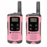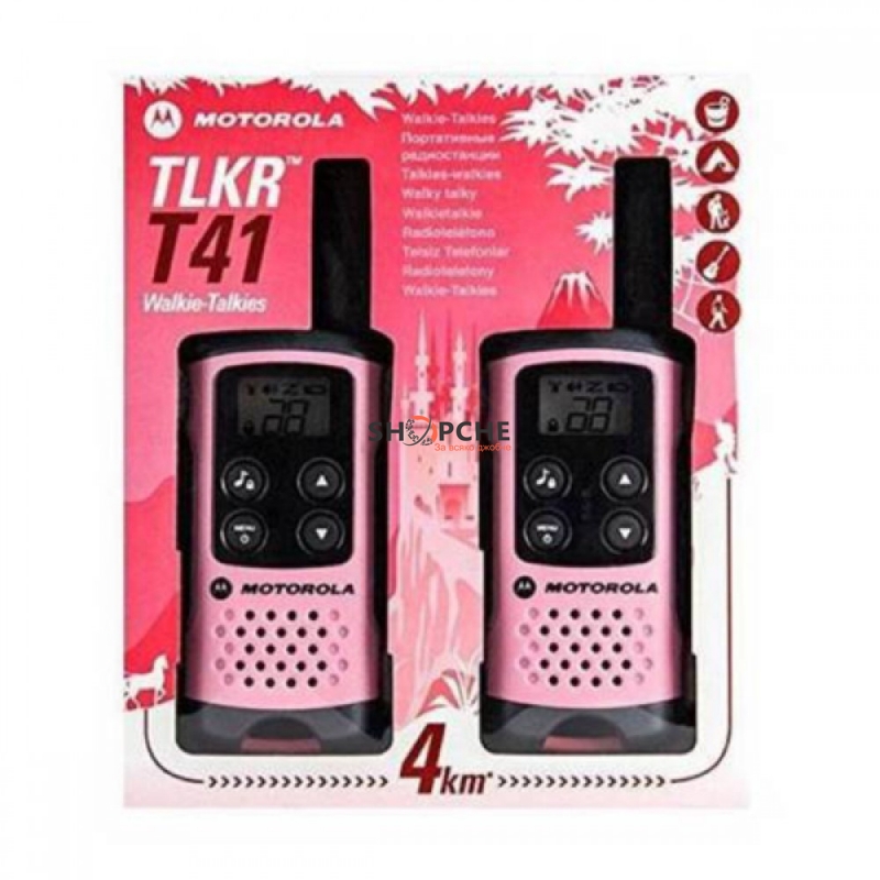 MOTOROLA TLKR T41 PINK са свободни за употреба без лиценз, използват работна честота 446 MHz и имат максимална предавателна мощност 500Mw. Моделът има осветен LCD дисплей, 8 канала и стабилен обхват.