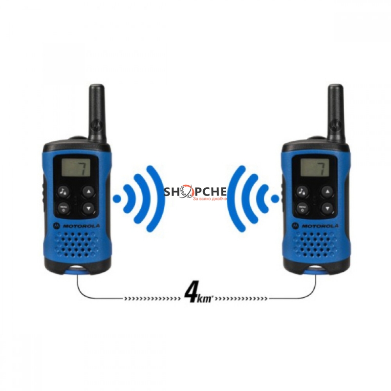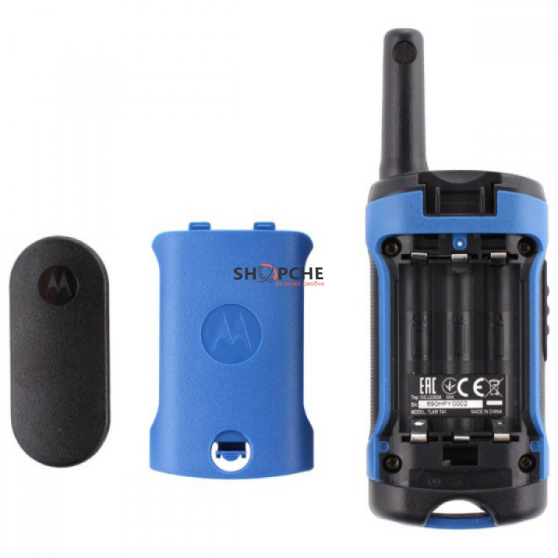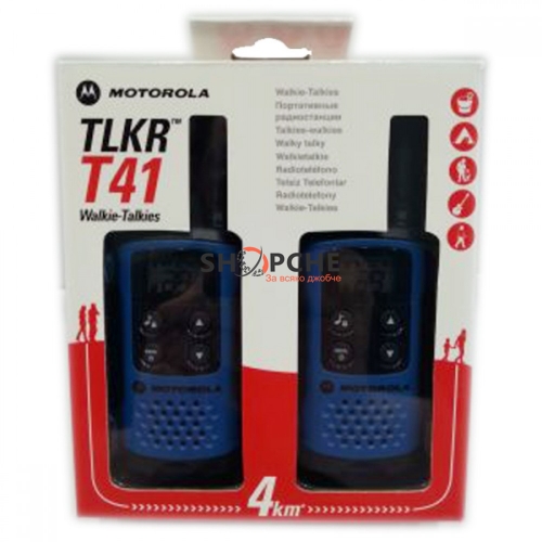 MOTOROLA TLKR T41 BLUE са свободни за употреба без лиценз, използват работна честота 446 MHz и имат максимална предавателна мощност 500Mw. Моделът има осветен LCD дисплей, 8 канала и стабилен обхват.