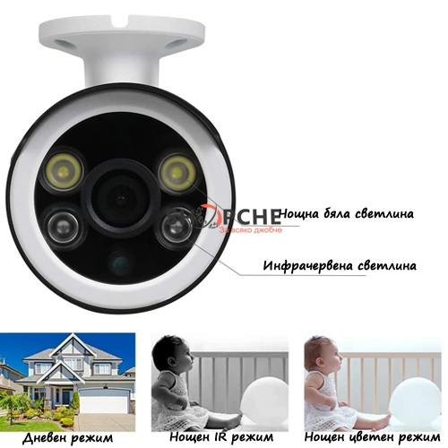 Камерата е оборудвана с 4 инфрачервени светлини – 2 от които за през нощта и 2 за през деня.