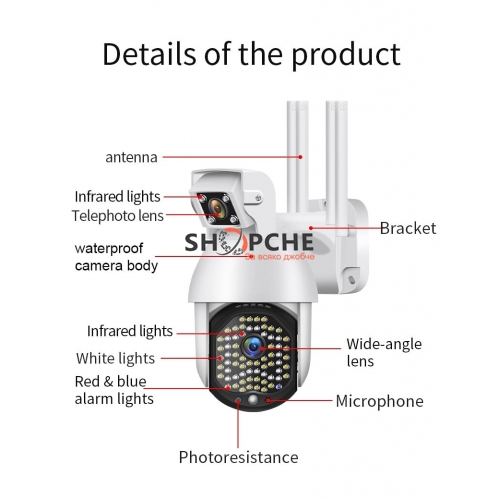 Камерата използва приложението Icam 365 Чисто нови въртящи (PTZ) на 320° градуса по хоризонтала и 90° градуса по вертикала се безжични WIFI IP Full HD камери със резолюция 1920х1080 FULLHD, 2.0MP Lend , 3.6mm фокус