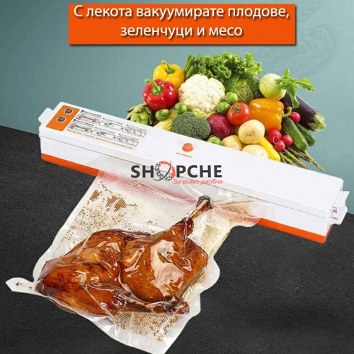Просто поставяте продуктите в найлон, притиснете с устройството и натиснете бутона за включване.