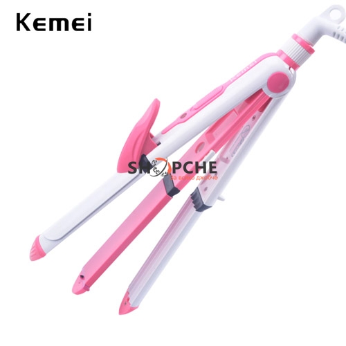 Kemei 3в1 КМ-1213 е с вградени приставки за къдрене, изправяне и обем (тип „вафлички“).