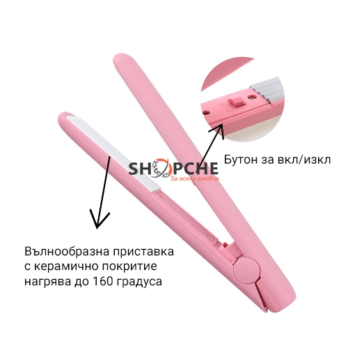 Мини пресата за коса е с керамично покритие, което при използване предпазва косата Ви от изгаряне.