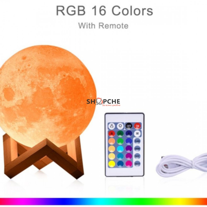 Акумулаторна лампа със стойка тип луна е изключително красива и функционален аксесоар, който ще краси дома или офиса Ви. Лампата се включва/изключва и си сменя режимите на светене, чрез тъч бутона, които е вграден в долната част на лампата или с дистанционното управление. Лампата свети в 16 разлини цвята.
