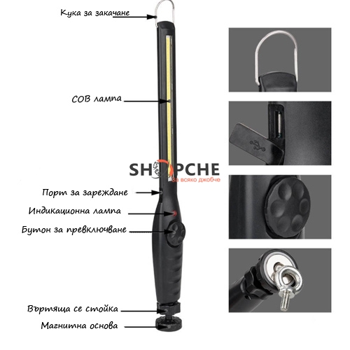 С вградена магнитна поставка, която позволява да я поставите на метална повърхност.