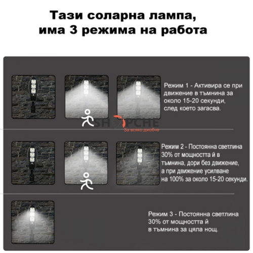 Режим 2 - Постоянна светлина 30% от мощността й в тъмнина, дори без движение, а при движение усилване на 100% за около 15-20 секунди.