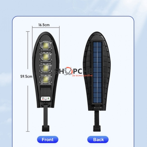 Спецификация:Слънчев панел: 5.5V 7W монокристаленLi-ion батерия 3,7v 8600mAhБрой светодиоди: 4 COBМощност: 400WЦветна температура 6400К - студена бялаСветлинен поток: 7000LmОбхват на осветлението: 140㎡Режим сензор: сензор за движение, активиращ се в тъмнотоФотосензор: активира се при Размери: Без стойка: 460 x 165mmСъс стойка: 595 x 165mmТегло: 691гр.