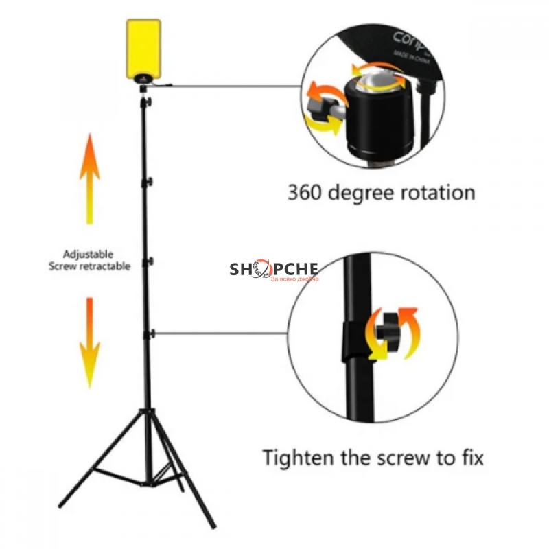 Телескопична стойка: Регулируемата телескопична стойка осигурява лесно позициониране на панела на желаната височина и ъгъл за оптимално осветление на всяка област.