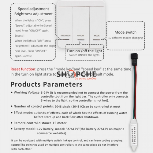 Дистанционно разстояние до 15M на открито, захранва се с 12V 27A батерия (включена)