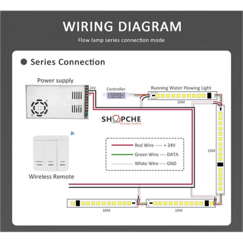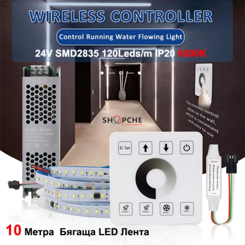 SMD2835 24VDC Бягаща LED лента, падаща светлина, безжичен контролер, гъвкава лента с 120 светодиода на метър, 10 метра дължина на ролката, захранващ адаптер