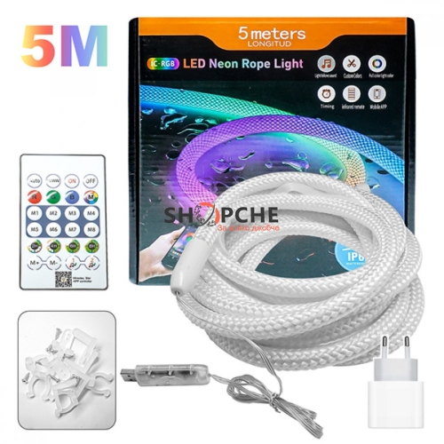 👉 Присъедини се към Viber общносттаСъздайте уникална атмосфера във вашия дом или градина с този гъвкав RGB LED неонов шнур тип въже с дължина 5 метра. Лентата предлага богат избор от цветове и светлинни режими – статични, динамични, музикални (реакция на звук), таймер, регулиране на яркост и скорост.