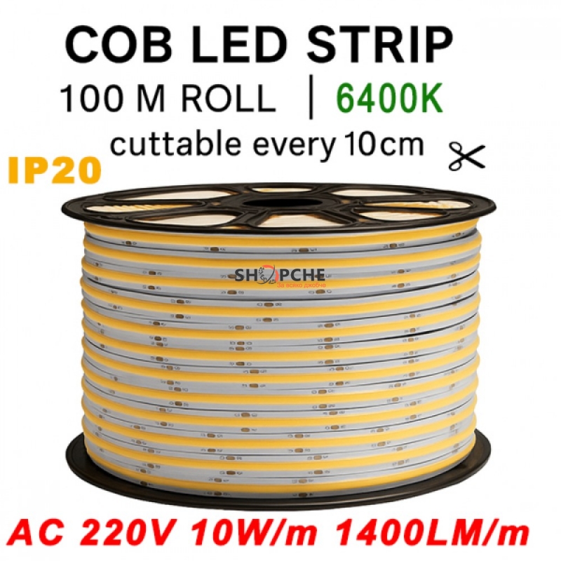 COB LED лента AC 220V, 10W/m, 6400K е идеалното решение за тези, които търсят мощна, икономична и визуално елегантна светлина.
