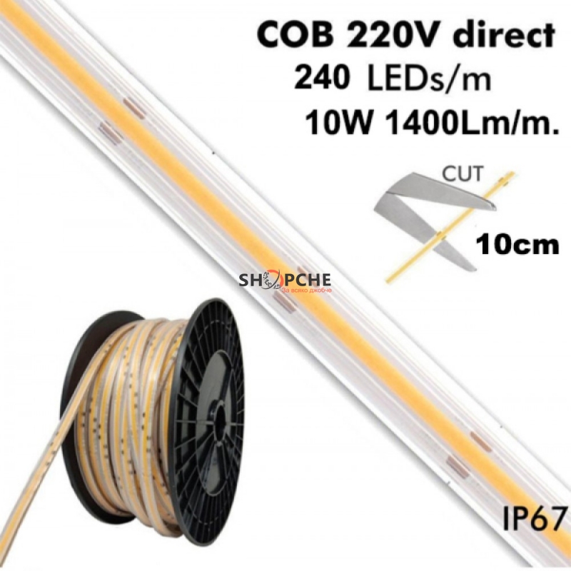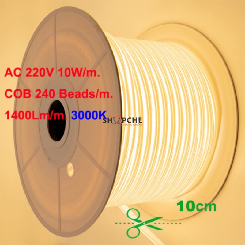LED COB лента, димираща LED лента, 240 LEDs, 10W LED лента, студена бяла светлина 3000K, водоустойчива LED лента, IP65 осветление, енергоспестяващо осветление, 220V LED осветление.