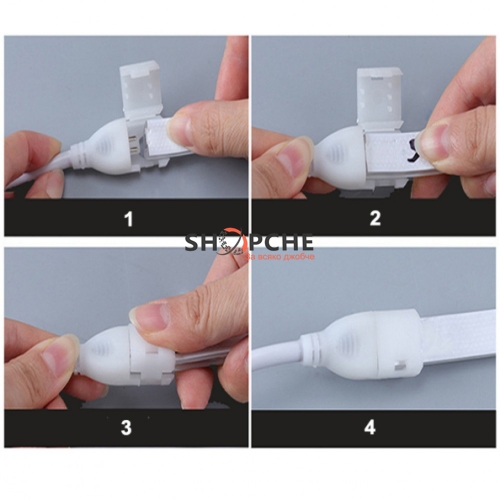 Захранването към мрежово напрежение се осъществява, само и единствено със захранващ накрайник, съобразен за този тип LED лента.