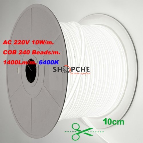 LED COB лента, димираща LED лента, 240 LEDs, 10W LED лента, студена бяла светлина 6400K, водоустойчива LED лента, IP65 осветление, енергоспестяващо осветление, 220V LED осветление.