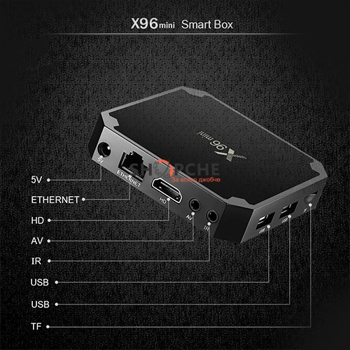 Портове: 1 * RJ-45 Ethernet jack, 1 * Micro SD/TF card slot, 2 * USB 2.0 ports, 1 * Micro USB port, 1 * HDMI port, 1 * Headphone jack, AV вход