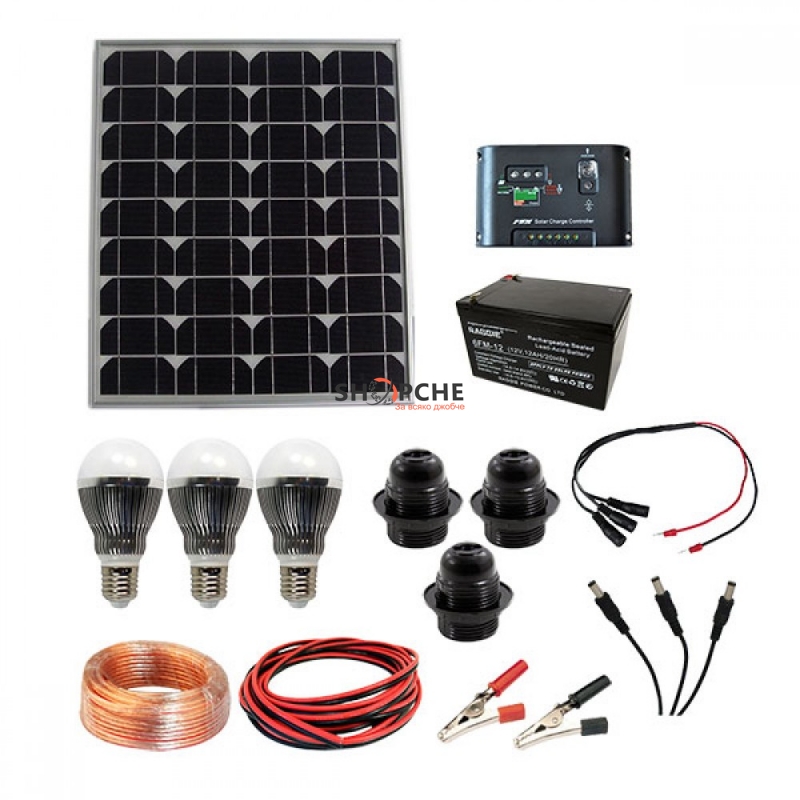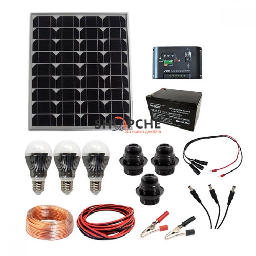 Комплекта включва:1 бр. Монокристален фотоволтаичен модул 40Wp1 бр. Акумулаторна батерия 12V 12Ah1 бр. PWM Соларен контролер 12V 5A3 бр. Е27 фасунга3 бр. Е27 LED крушка 5W3 бр. Мъжки захранващи букси3 бр. Женски захранващи букси2 бр. Щипки - крокодилче15 М. Силиконов кабел 2x1,5 м210 М. Черно/червен кабел 2x1,5 м2