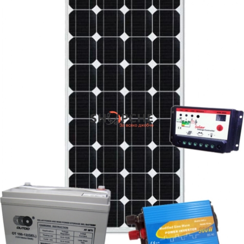 Тази фотоволтаична система включваща соларен панел 100Wp, соларен контролер 10A, акумулаторна батерия 12V 75Ah и инвертор - преобразувател на напрежение от 12V на 220V с мощност 300W, Ви гарантира нормално битуване при условия без електрическо захранване.