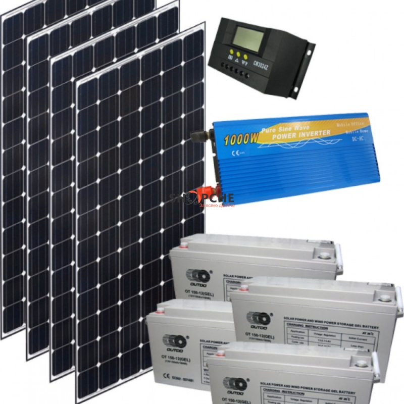 Тази фотоволтаична система включваща соларени панели 1000Wp, PWM соларен контролер 50A с LCD дисплей, акумулаторен блок 24V 300Ah и синусоидален инвертор - преобразувател на напрежение от 24V на 220V с мощност 1000W, Ви гарантира нормално битуване при условия без електрическо захранване.