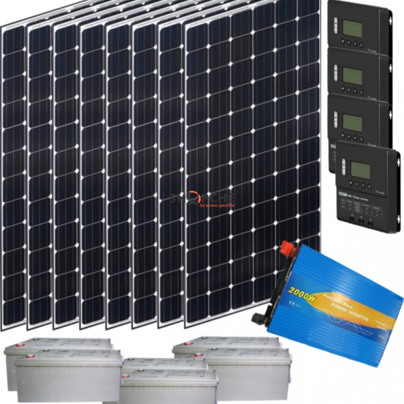 Тази фотоволтаична система включваща соларени панели 2000Wp, MPPT соларен контролер 80A с LCD дисплей, акумулаторен блок 24V 600Ah и синусоидален инвертор - преобразувател на напрежение от 24V на 220V с мощност 2000W, Ви гарантира нормално битуване при условия без електрическо захранване.