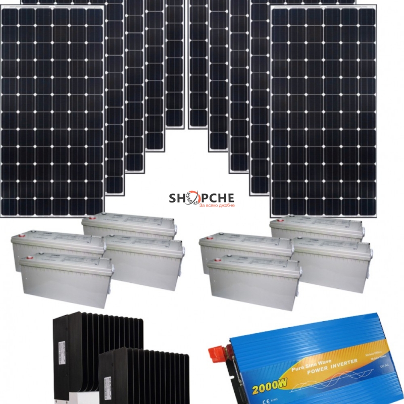 Тази фотоволтаична система включваща соларени панели 2500Wp, MPPT соларен контролер 120A с LCD дисплей, акумулаторен блок 24V 800Ah и синусоидален инвертор - преобразувател на напрежение от 24V на 220V с мощност 2000W, Ви гарантира нормално битуване при условия без електрическо захранване.