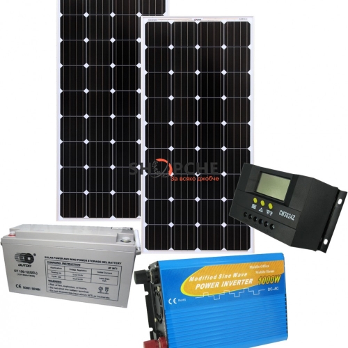 Тази фотоволтаична система включваща соларени панели 300Wp, соларен контролер 20A с LCD дисплей, акумулаторна батерия 12V 150Ah и инвертор - преобразувател на напрежение от 12V на 220V с мощност 1000W, Ви гарантира нормално битуване при условия без електрическо захранване.