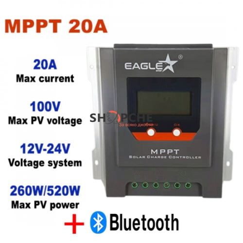 MPPT контролер за соларна система, Bluetooth соларен контролер, 20A соларен контролер, управление на соларна енергия, 12V/24V соларен контролер, оф-грид соларна система, Eaglestar соларен контролер.