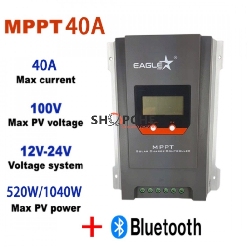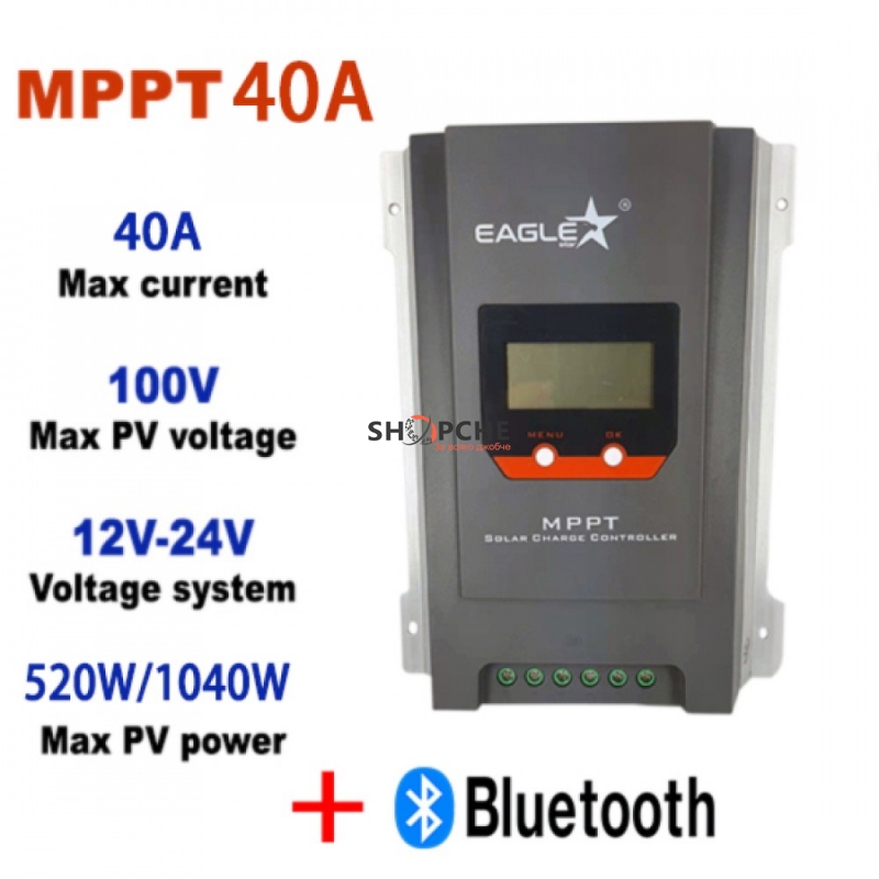 MPPT контролер за соларна система, Bluetooth соларен контролер, 40A соларен контролер, управление на соларна енергия, 12V/24V соларен контролер, оф-грид соларна система, Eaglestar соларен контролер.