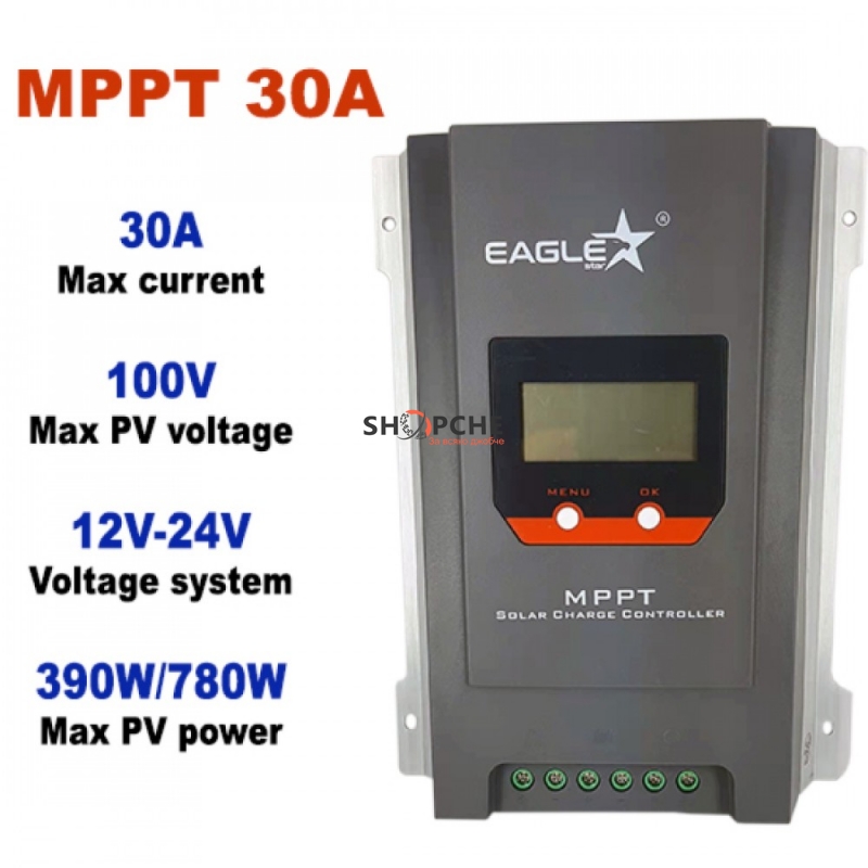 Максимална мощност на соларният панел: 30A (Автоматично превключва между 12V и 24V) този контролер-регулатор е предназначен за зареждане на акумулатори, чрез соларен панел. Когато напрежението на батерията не е достатъчно, контролерът играе роля на защита, като не позволява напрежението да падне под необходимото за зареждане на акумулаторът.