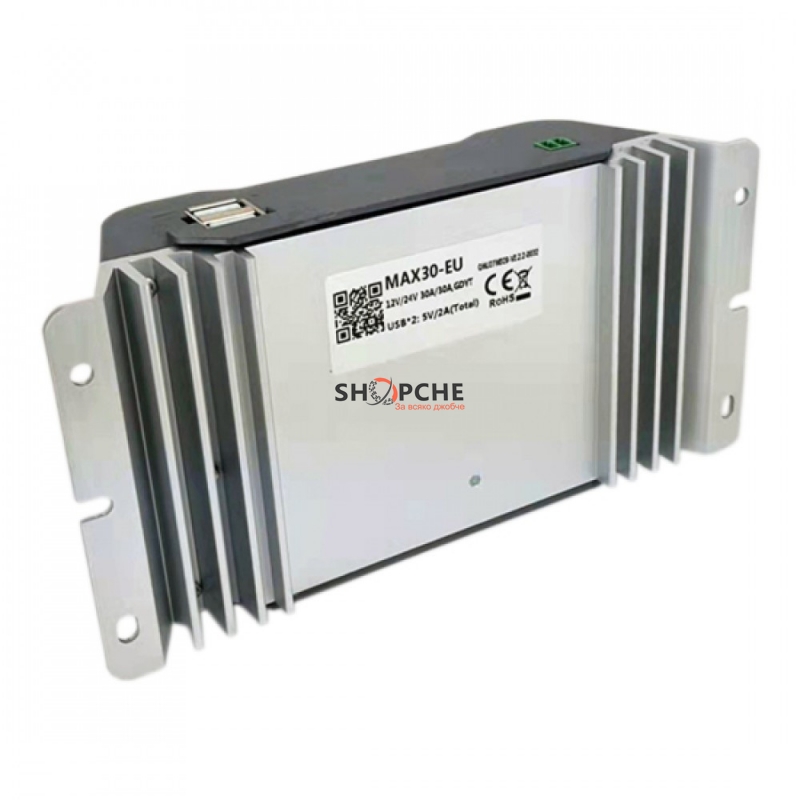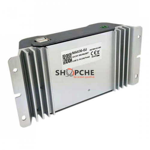 👉 Присъедини се към Viber общносттаМодел MAX20-EUНапрежение на акумулаторите: 12/24V (автоматично разпознаване)Максимален заряден ток на акумулаторите: 20AМаксимално допустимо напрежение на фотоволтаиците: 25V / 50VМаксимално допустима мощност на слънчевия панел: 240W (12V), 480W (24V)Собствена консумация: 8mA / 12mAАвтоматично изключване на консуматор: ДаРежими фотореле: Контрол на светлината (автоматично), контрол на светлината + време, ръчно управление, режим на постоянно включванеЗащита: обратен поляритет на акумулаторите (предпазител), късо съединение на изхода, висока температураРаботна температура: от -25 до +55°С (на пълна мощност)Макс. Влажност (без конденз): 95%Водоустойчиво ниво: IP32