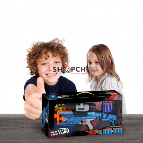 Детско оръжие с мерник, цев, опорно рамо за оръжие и цилиндричен пълнител за 12 дунапренови стрелички. Заредете дартс и играта започва. Маркирайте целта за по-висок резултат. Прекрасен подарък за всяко момче!