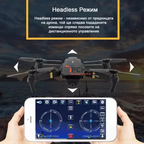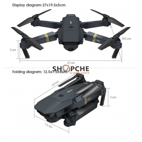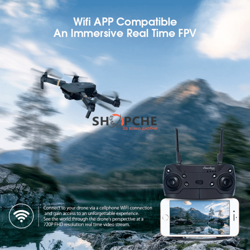 Функция: Нагоре / надолу, Напред / назад, Завиване наляво / надясно, Полет отстрани, Скорост на полета на 3 нива, LED светлина, Режим без глава, Автоматично връщане с един клавиш, Режим задържане на височина, WiFi FPV