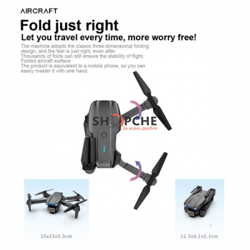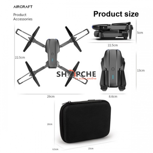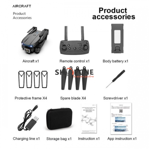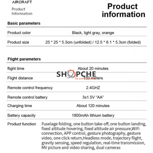 Функция: Нагоре / надолу, Напред / назад, Завиване наляво / надясно, Полет отстрани, Скорост на полета на 3 нива, LED светлина, Режим без глава, Автоматично връщане с един клавиш, Режим задържане на височина, WiFi FPV