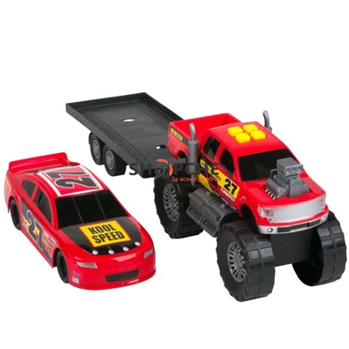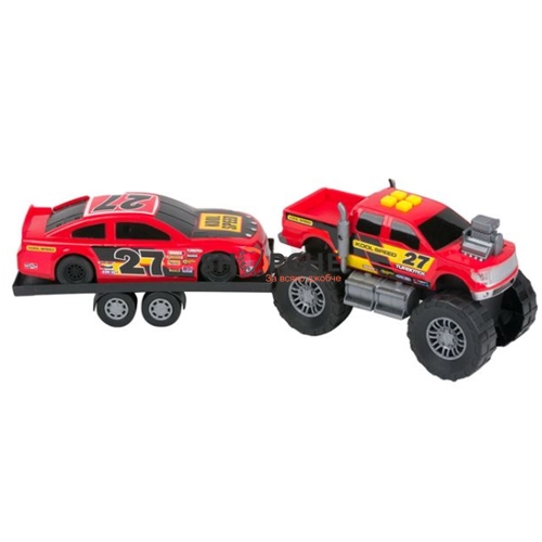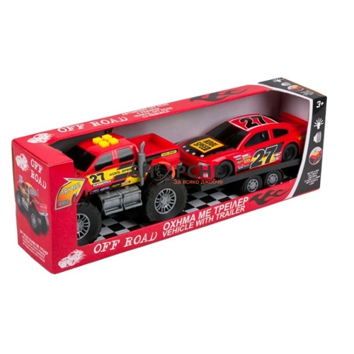 👉 Присъедини се към Viber общносттаСтрахотен комплект от 4Х4 Джипка с платформа, която превозва състезателен автомобил.