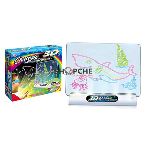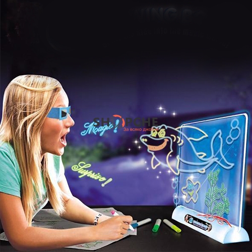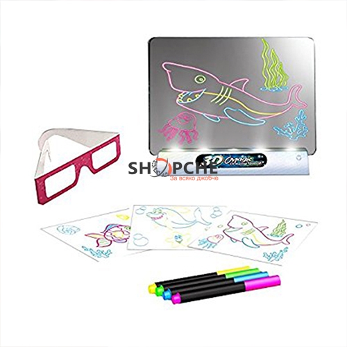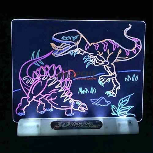 👉 Присъедини се към Viber общносттаПригответе се за истинско 3D приключение с вашите рисунки. Просто прекопирайте рисунките на динозаври, които ще намерите в пакета върху прозрачната пластмасова дъска с флоуресцентните маркери от различни цветове.След което поставете дъската върху LED поставката. Сложете оч илата и се потопете в света на 3D. Не само това, децата могат да нарисуват, каквато рисунка си пожелаят, на който и да е анимационен герой или прекопират някоя друга рисунка от книжките или Вашия таблет, използвайки маркерите и просто да сложат 3D очилата и да се наслаждават на преживяванията. Дъската може да бъде почистена и да се ползва отново и отново.