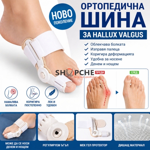 Предлагаме висококачествена ортопедична шина, специално създадена за хора с изкривяване на палеца (Hallux Valgus / кокалче).