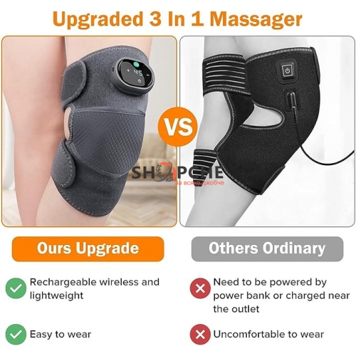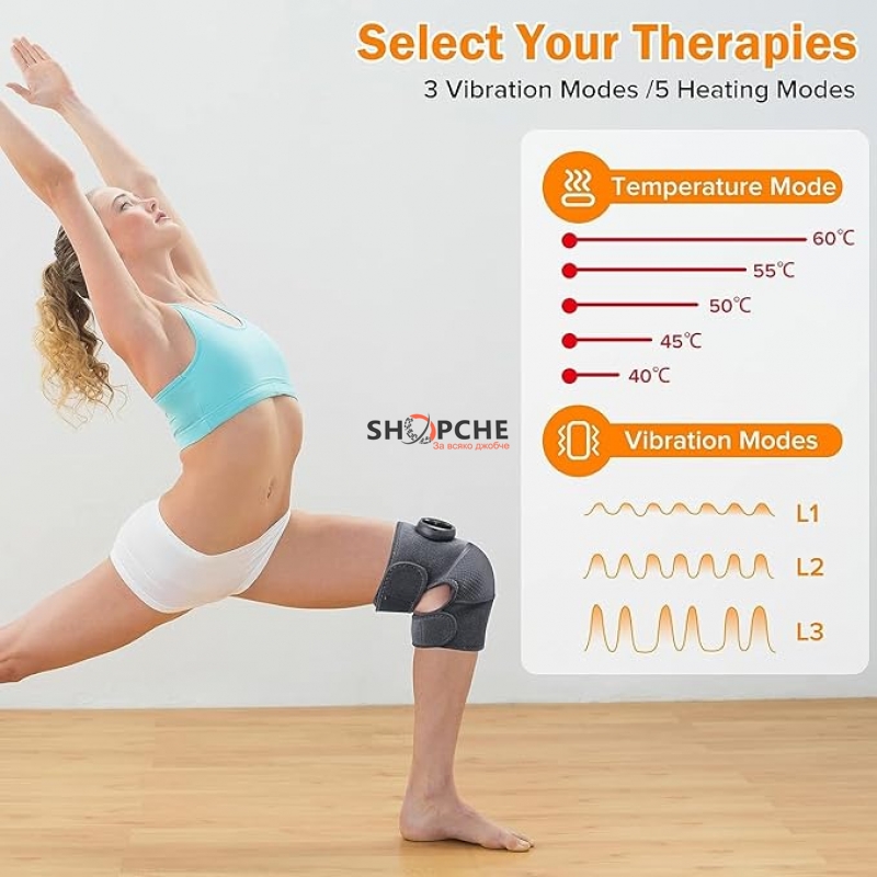 Масажор с подгряване е безжичен компресионен уред за коляно, лакът и рамо. Съчетава вибрации и контролирано топлинно подгряване, за да отпусне мускулното напрежение, да намали усещането за скованост и да подобри локалния комфорт в ставите.