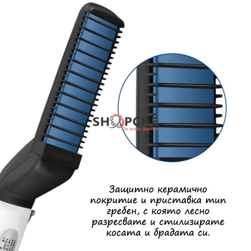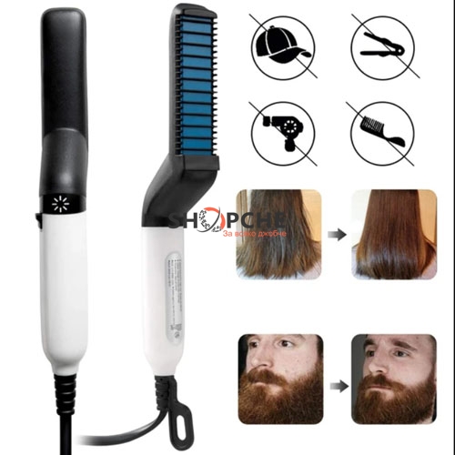 Електрическият гребен се справя безпроблемно с непокорната брада и коса, като заглажда стъчащите косъмчета.